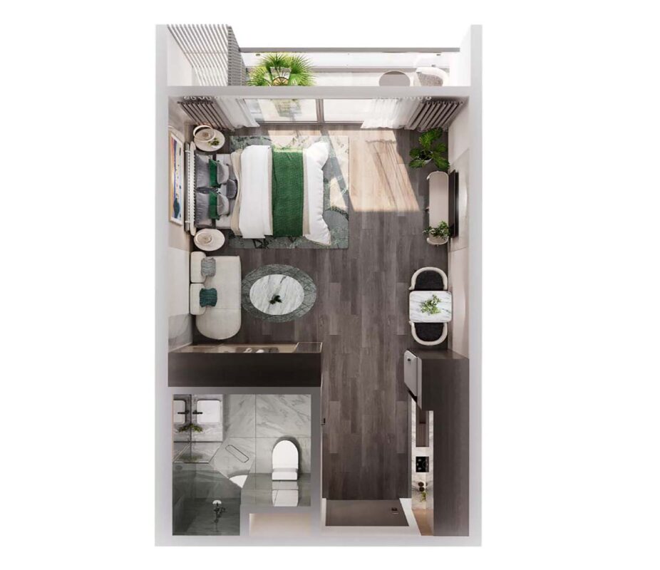 Studio: 30m²–33m² – Không gian tối ưu cho người trẻ độc thân, hoặc cặp đôi.