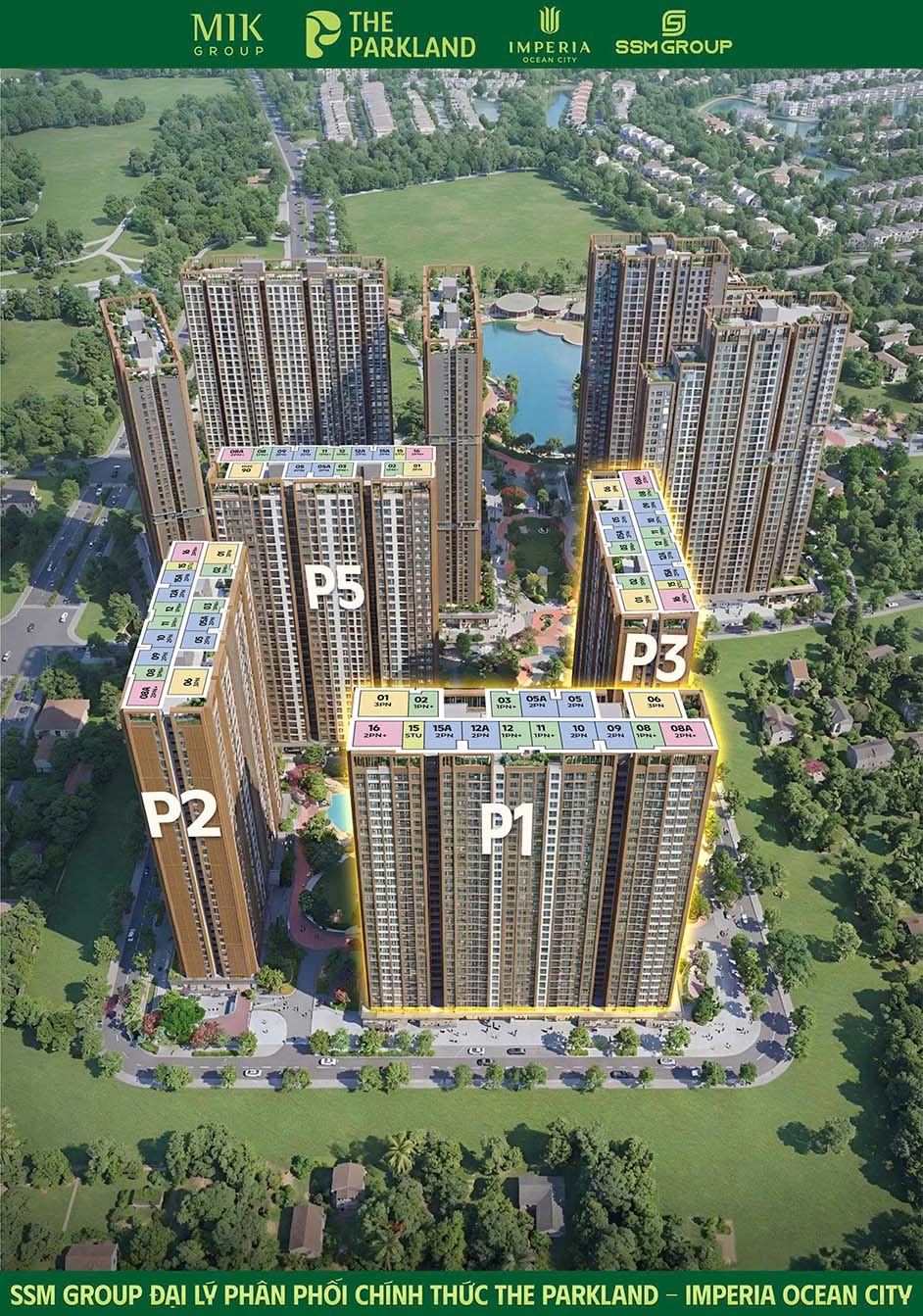 Giai đoạn 1 của The Park Land bao gồm 9 tòa căn hộ cao 35 tầng. Trong đó bao gồm 4 tòa Spring Garden là P1, P2, P3 và P5 sẽ được mở bán đầu tiên trong tháng 12/2025. Prime Garden gồm 3 tòa, và Forest Garden gồm 2 tòa. Chung cư Ocean Park 2 của MIK với concept “Sống nhịp phố, thở hồn xanh”, lấy ý tưởng là công viên Central Park tại New York làm công viên trung tâm vận hành cho toàn khu, hệ thống công viên vệ tinh & mảng xanh đan cài từng bước chân và podium thương mại chạy dài – “bộ kích hoạt” nhịp sống đô thị.